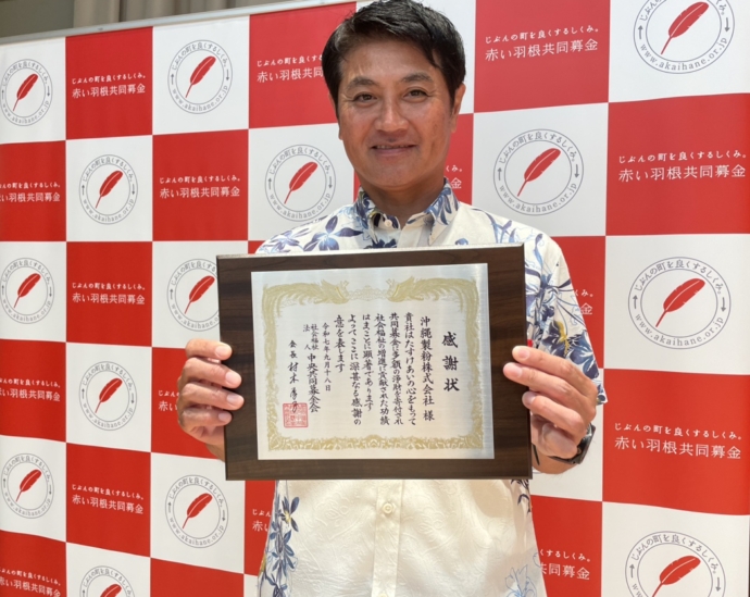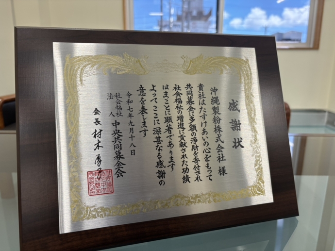 このたび沖縄製粉株式会社は、赤い羽根共同募金への寄付活動に対して、社会福祉法人中央共同募金会様より感謝状をいただきました。