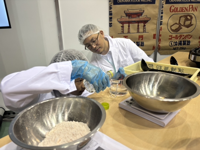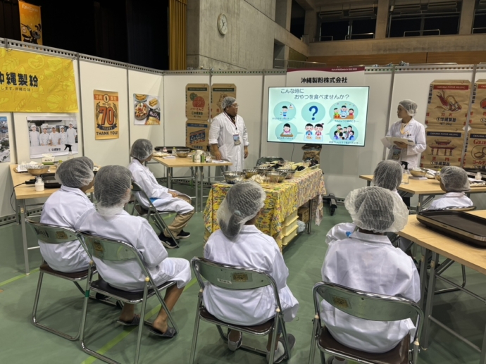 当社ブースでは、商品開発者の仕事体験として、オリジナルのちんびんミックス粉を開発するコーナーをご提供しました。参加されたお子さまは、弊社技術開発部の社員のアドバイスを受けながら材料の種類を選び、工夫を重ねてオリジナルのちんびんミックス粉を作り上げておりました。
